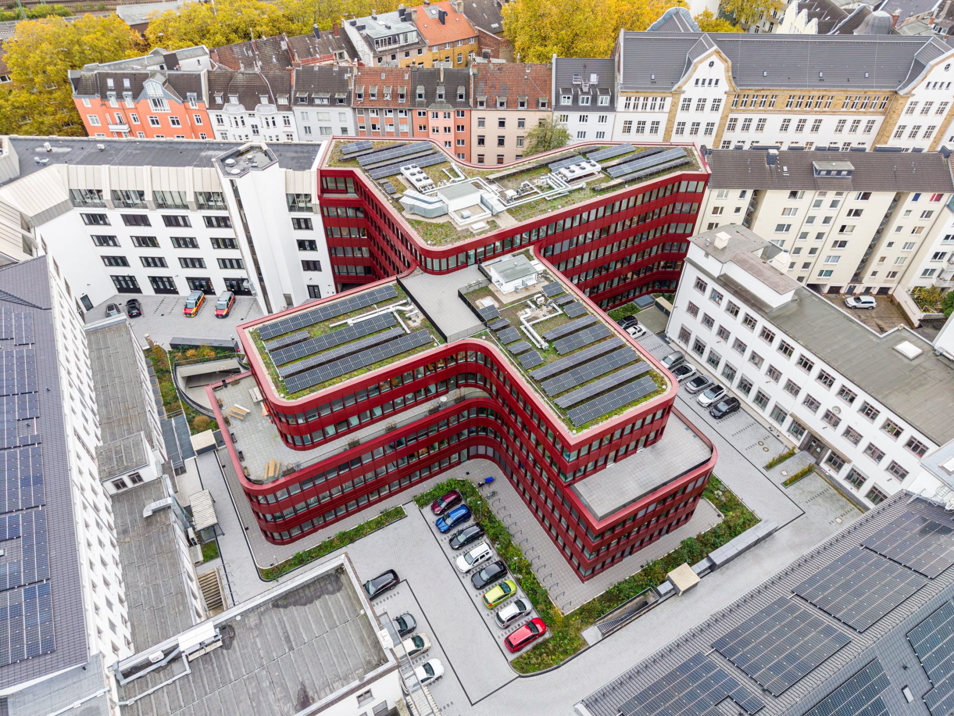 The building aims to achieve DGNB Gold certification, has already been pre-certified with WiredScore Gold, and meets the requirements for the KfW Efficiency House 40 standard thanks to features like its solar power system.