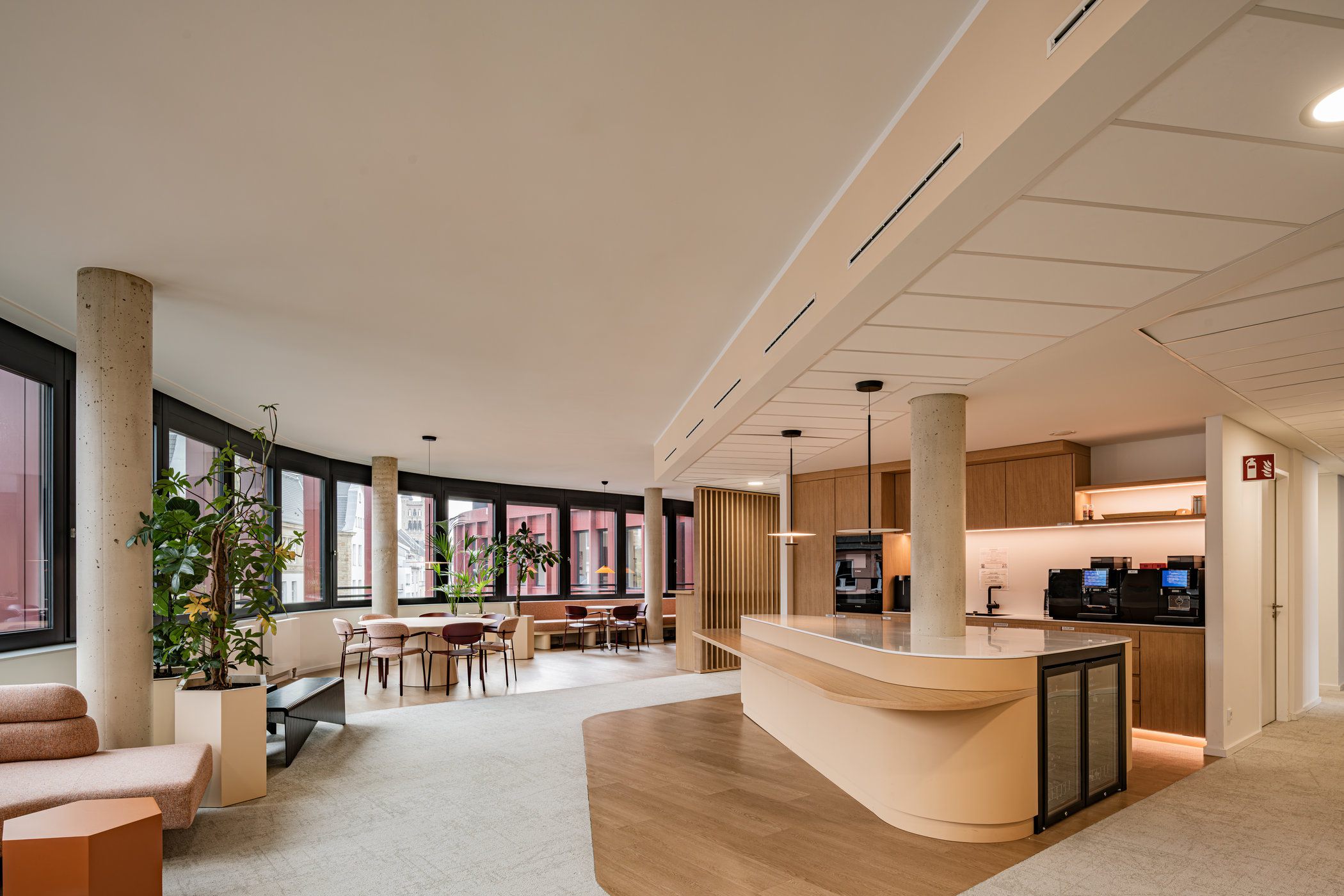 Today, the new office building is confidently situated within the existing structures around the perimeter of the block. Six stories with a setback, the height of the street frontage remains in line with its neighbors on either side. The building sits flush with the buildings at its flanks before curving in at the center with an unexpected flourish. This flowing movement creates a protected forecourt within the building line, highlights the position of the main entrance, and ultimately gives the building its name. The large display windows on the ground floor of the Curve Offices lend it an open, inviting character. With red steel panels and slender pilaster strips positioned in front of continuous window strips, the facade of the office floors above takes on a more austere appearance, which is given a pleasant dynamic by the compression of the lines created by the curves.