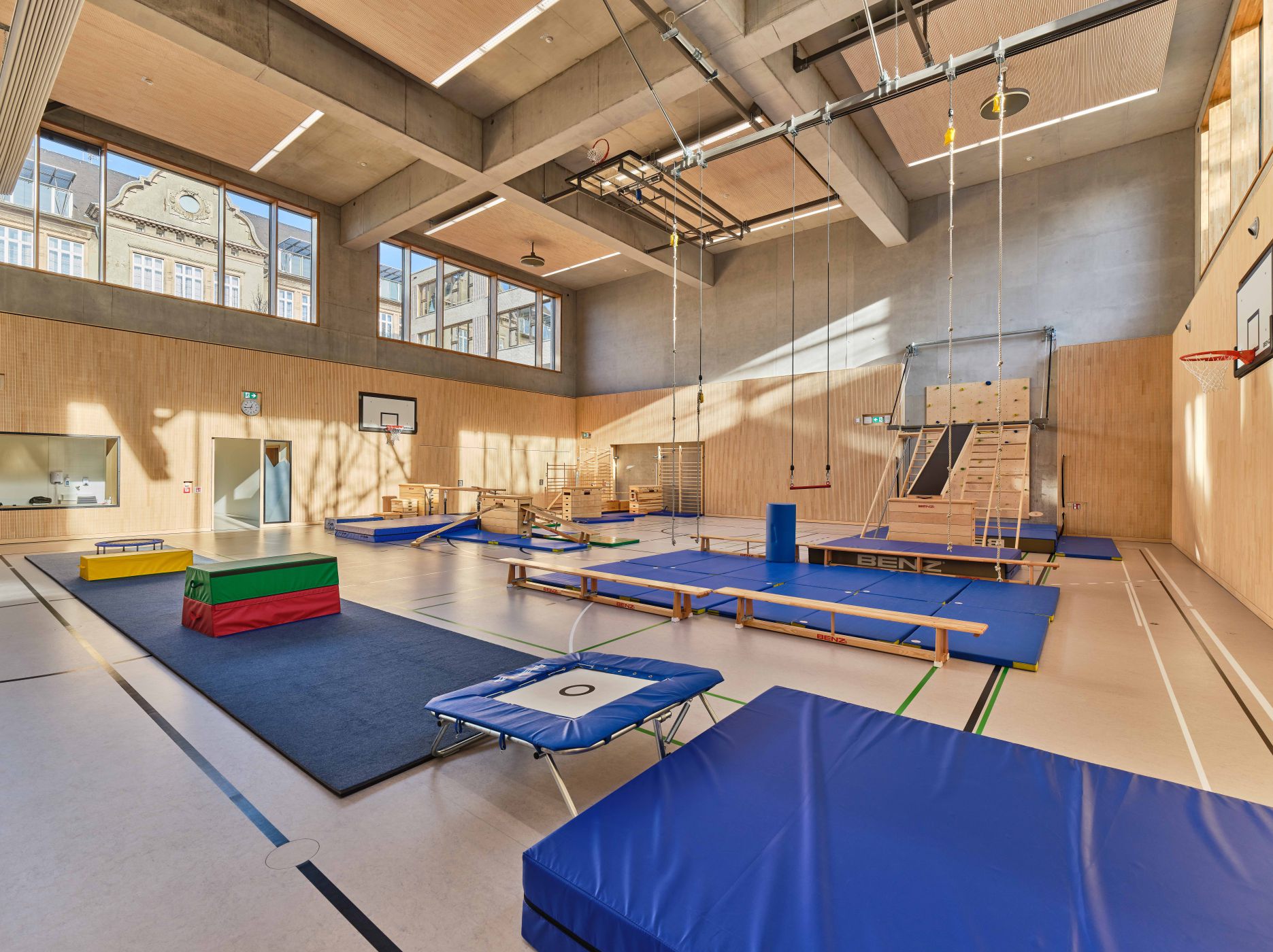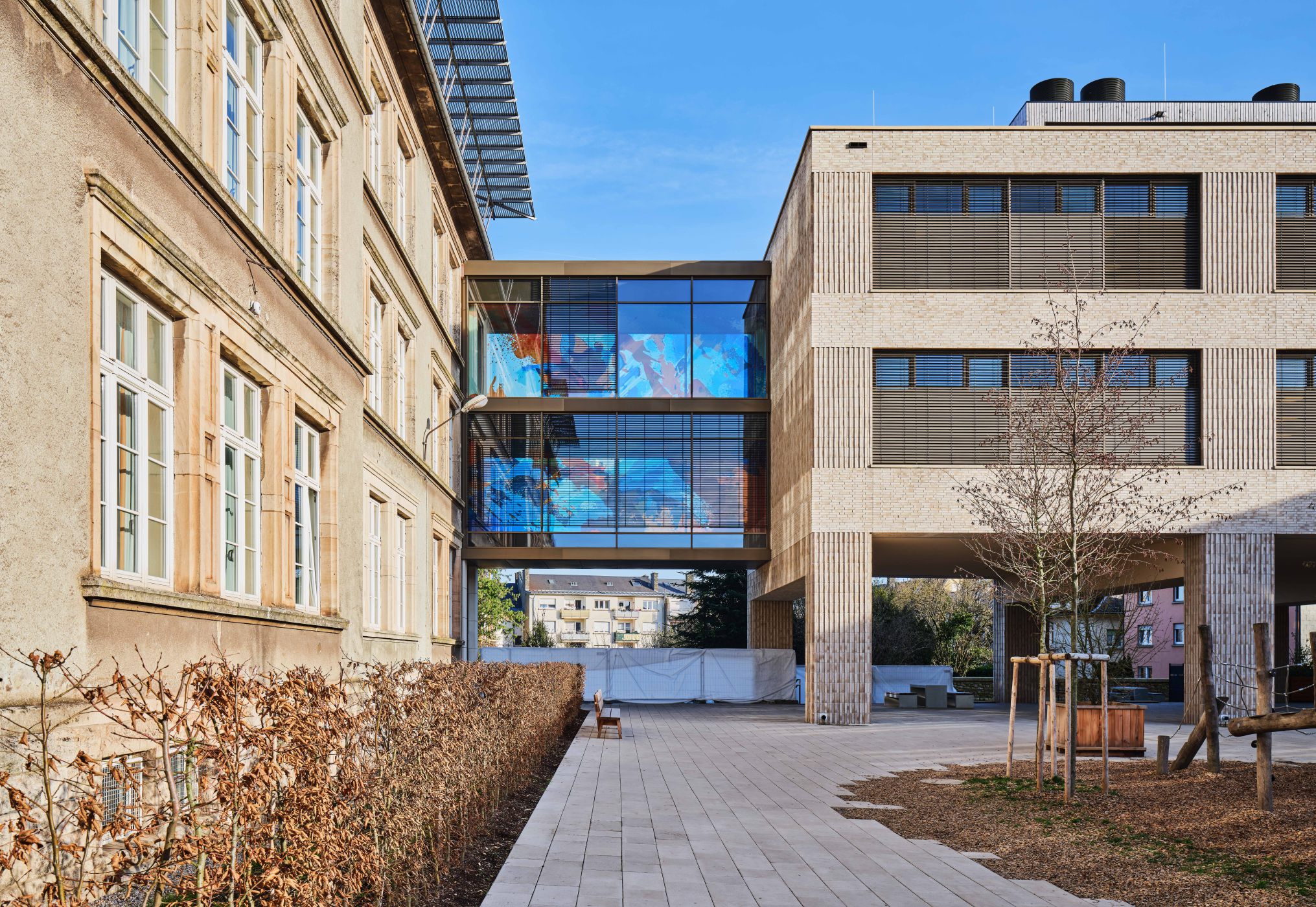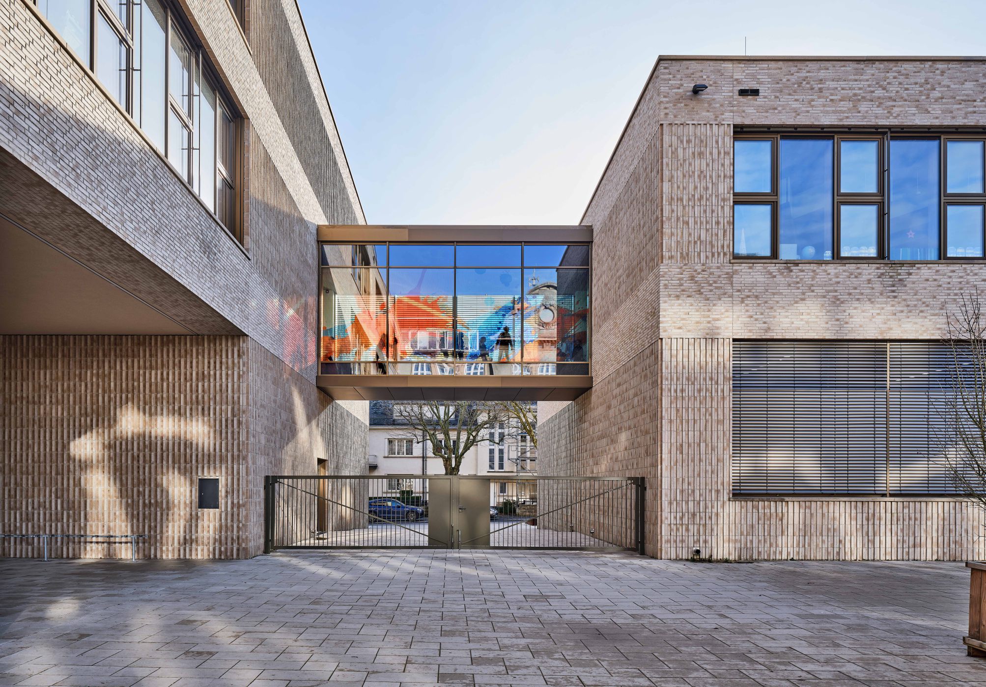 The task of the competition was the urban redevelopment of the "Bruch" district, the renovation and extension of the existing elementary school and the construction of a new preschool and a childcare center. The project had to be realized in several construction phases without temporary solutions. The formerly "impermeable" block of houses has been transformed into three building ensembles, each of which encloses a garden courtyard with a different quality of open space. The first courtyard is surrounded by all the new and old school buildings. The second courtyard contains, among other things, the open space of the pre-school. The third courtyard is defined by a possible new building that can accommodate apartments or, optionally, other school facilities.
