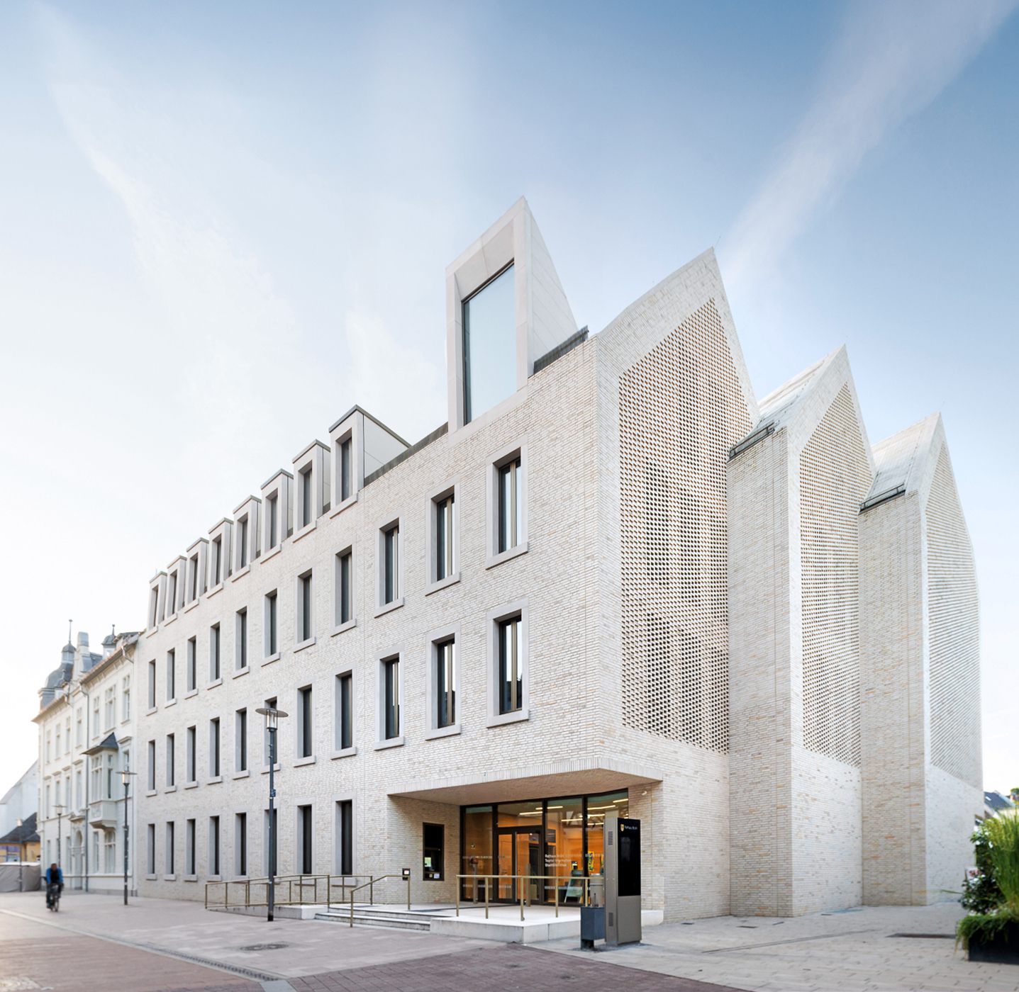 The new building plays with the idea of different urban spaces and proportions in Brühl’s historic city center. The front building references the form of the historic town hall, creating a cubature that is at once unique and also typical of the region. The three interlocking structures are oriented so that their gables face the adjacent street. The brickwork on the gable is partially perforated so that it filters the light coming into the underlying windows. The same light-colored bricks are used for the facade and the roof, thus reinforcing the cubic effect of the new building.