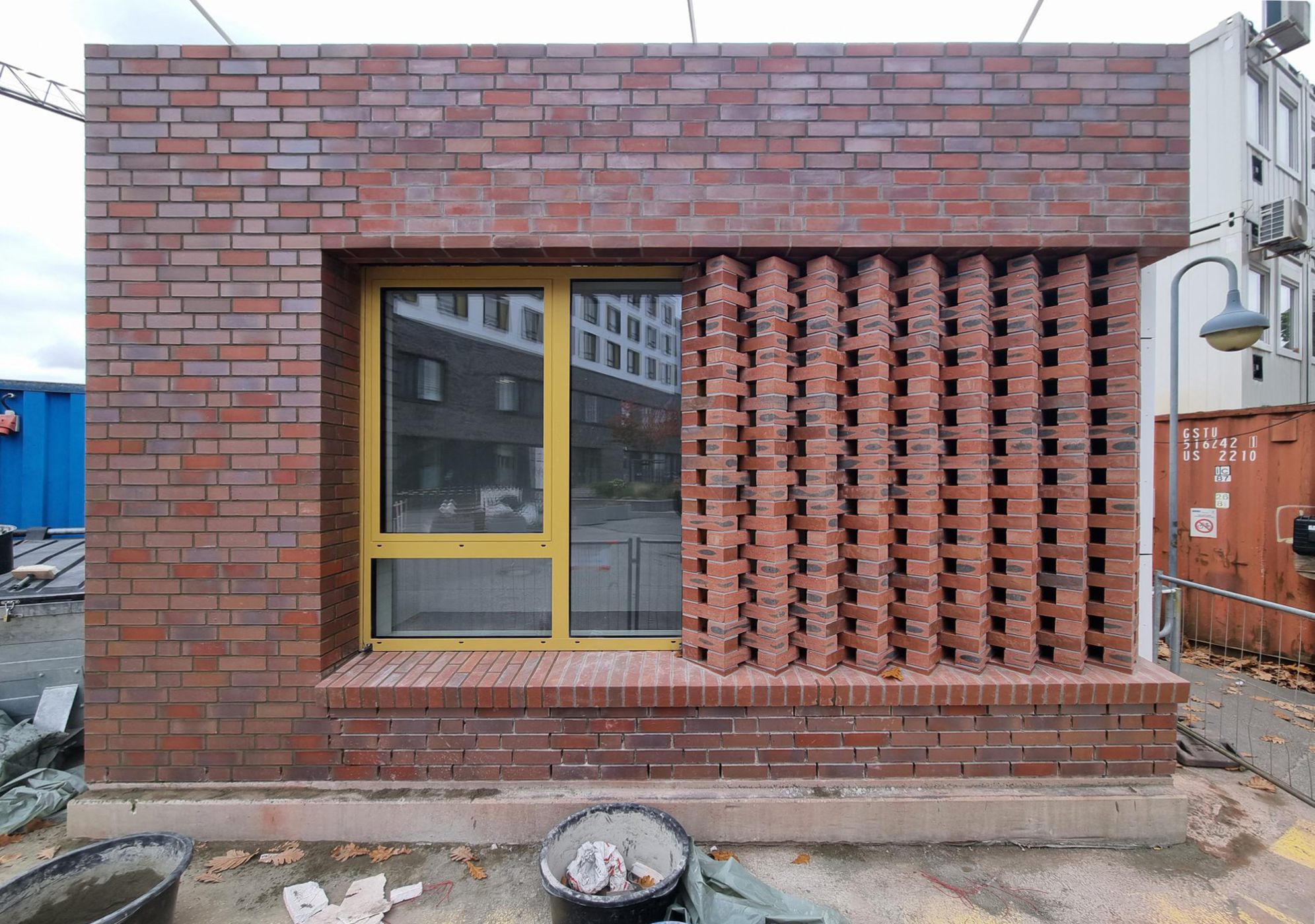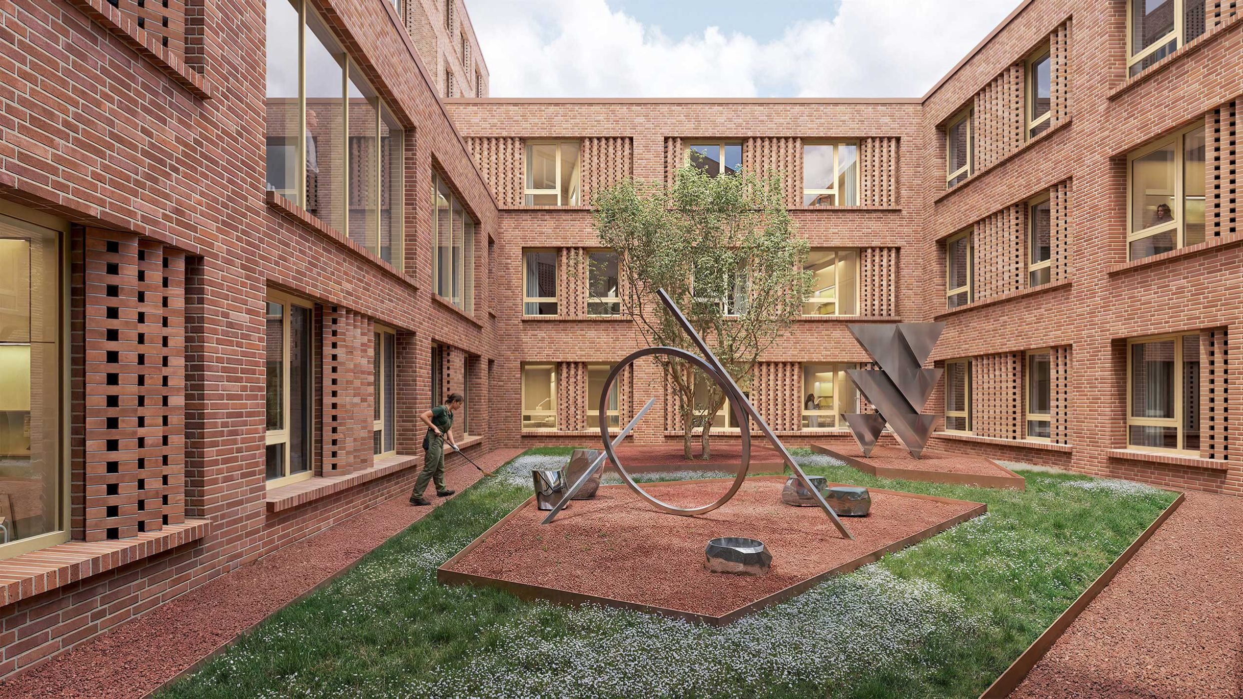 Das Fassadenkonzept setzt die Corporate Architecture der Erweiterung des Hauptgebäudes (Fertigstellung 2019) fort. Unser Entwurf sieht eine Klinkerfassade vor, die sich harmonisch in die umliegende Bebauung einfügt. Ein historisches Bleiglasfenster aus dem Vorgängerbau wird integriert.