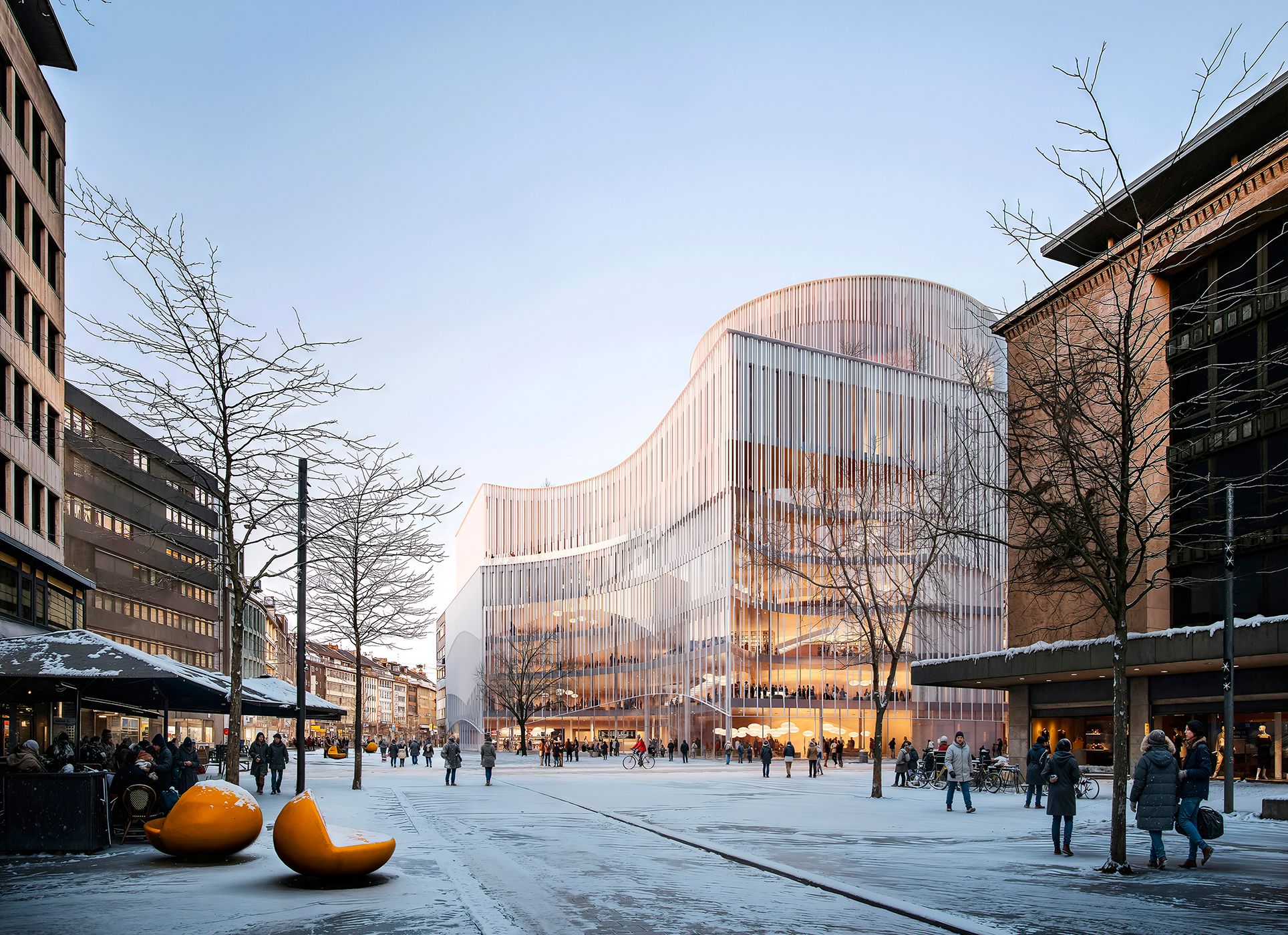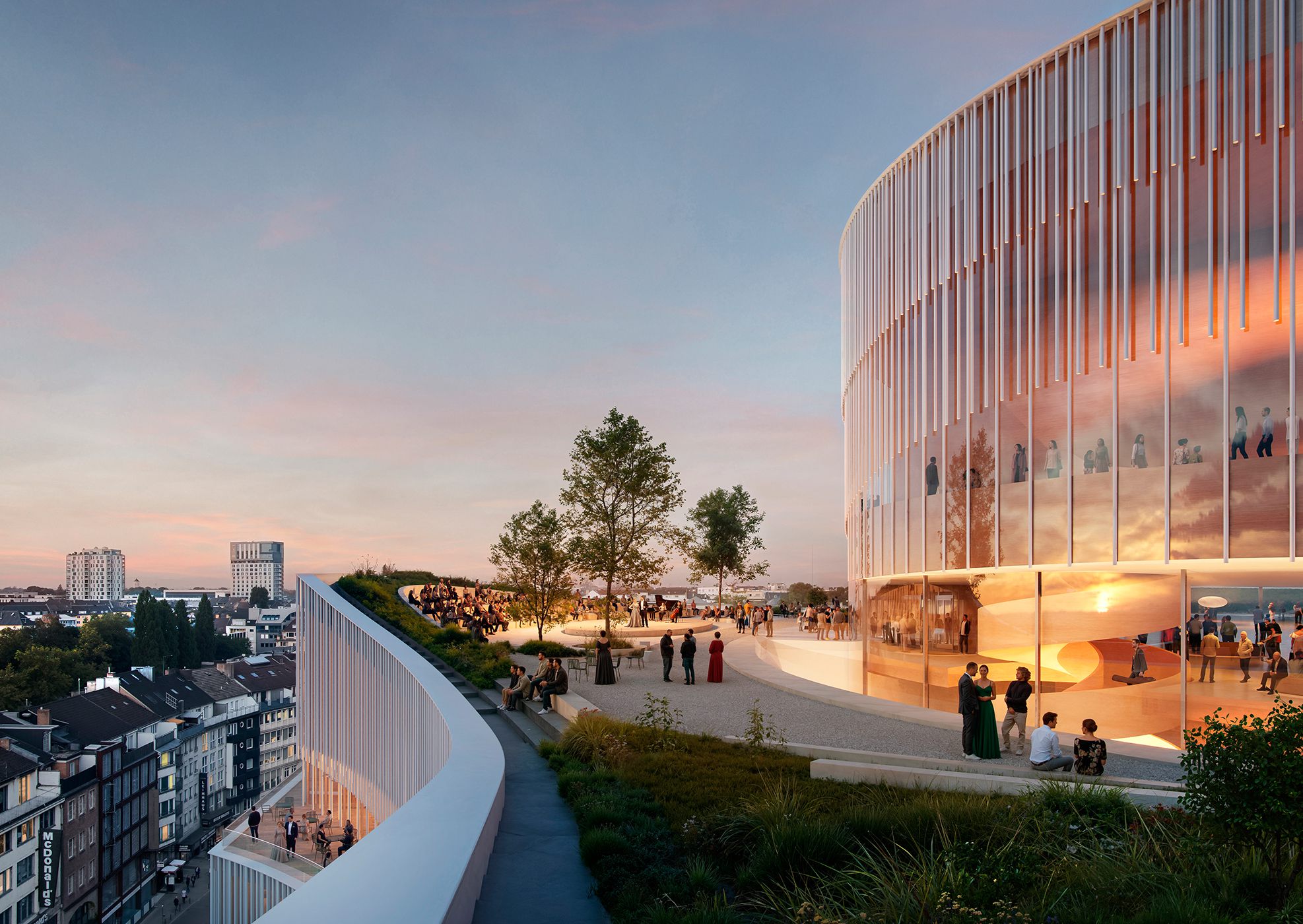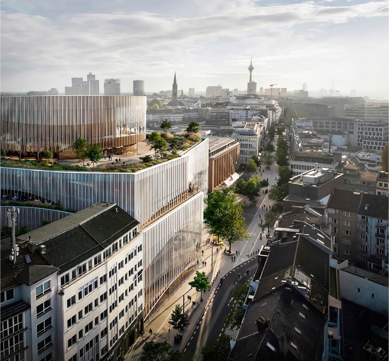 Der ovale Aufsatz über dem Opernsaal verleiht dem Gebäude eine Markanz in der Stadtsilhouette. An drei Straßenseiten werden die Fassadenlinie der Nachbarn fortgeführt. Einzig an der Ecke von Tonhallenstraße und Am Wehrhahn erzeugt der Entwurf eine rückspringende, geschwungene Geste, die die bereits bestehende Straßenaufweitung vor dem ehemaligen Kaufhaus aufnimmt und zum Abschluss führt. Auch die vorhandene Vordach- bzw. Sockelhöhe der Umgebung wird mittels einer Auskragung über dem Haupteingang aufgenommen. So entstehen eine räumliche Aufweitung der Fußgängerzone und zugleich einen angemessenen Vorbereich des neuen Opernhauses: eine zeitgenössische Interpretation des klassischen Opernplatzes.