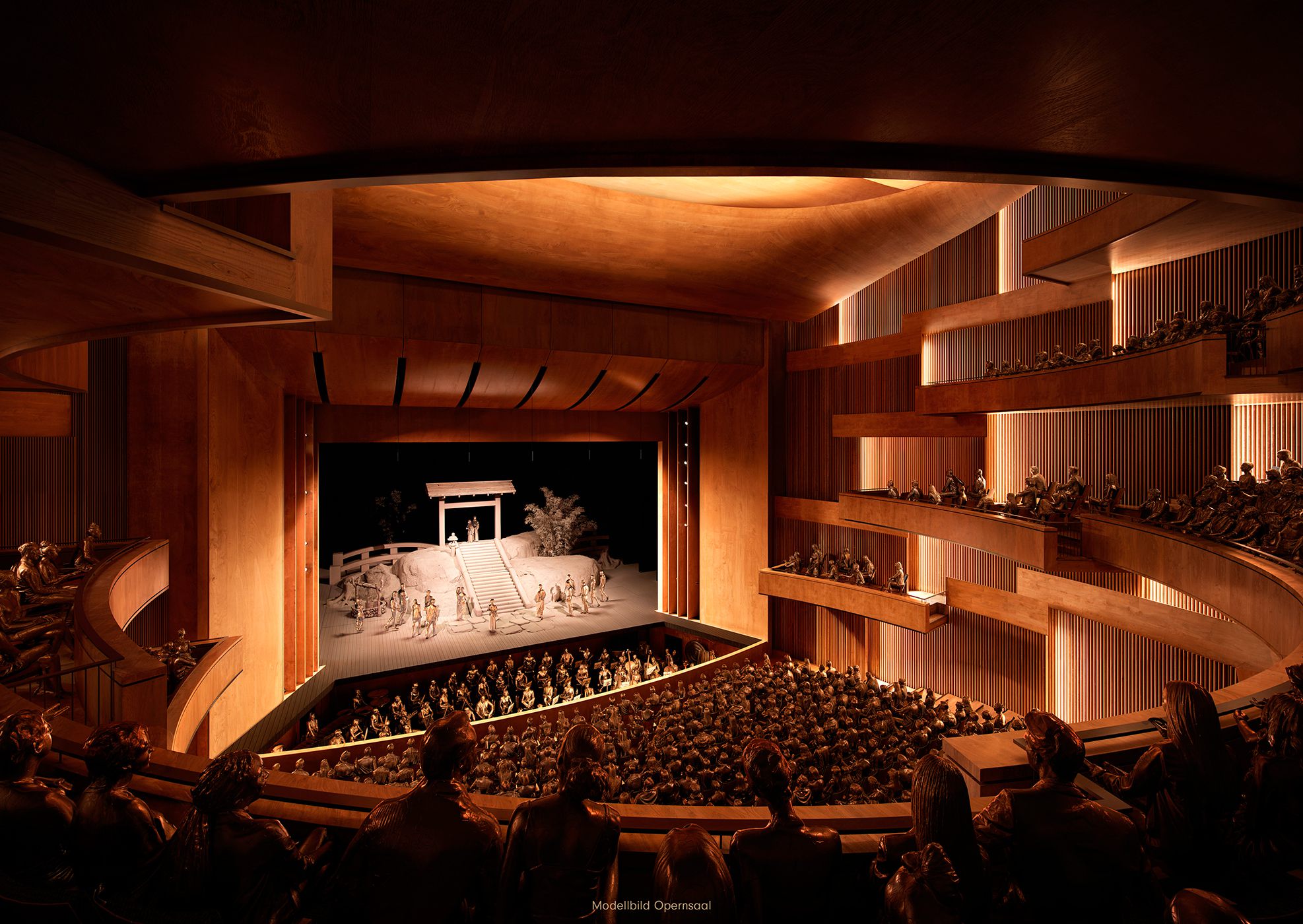Neubau Opernhaus, Großer Saal, Studiobühne, Junge Bühne, Workshop-Räume, Musikschule, Bibliothek, Gastronomie, Shop, Garderoben, Werkstätten, Fundus, Verwaltung
