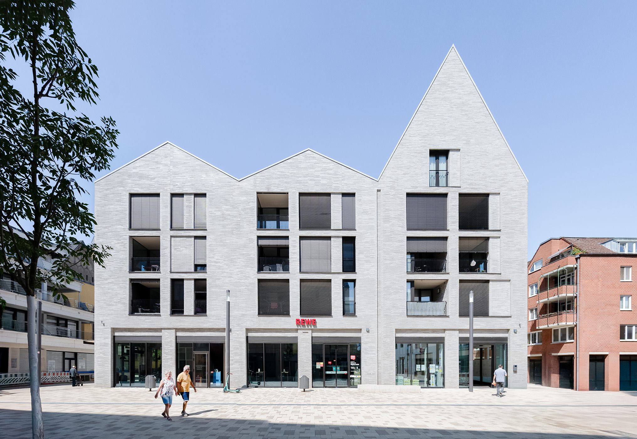 Es folgte der Hochbau von Haus 1 (JSWD für die Stadt Köln), zwischen der St. Josef-Kirche und der Fußgängerbrücke über der Ortdurchfahrt platziert. Der geschlossene Baublock ist mittels kleinteiliger Gliederung der Kubatur sowie der Fassade und Dächer in mehrere Hauseinheiten mit eigenen Eingängen unterteilt. Die Materialität der hellen Klinker der Fassade wird auch in der Dachfläche übernommen.